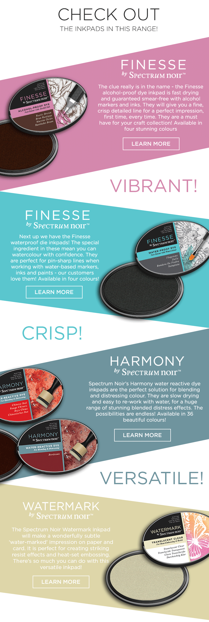 We are beyond excited to introduce you to the brand new inkpad range from Spectrum Noir! These amazing inkpads have been in the making for the last two years, in which time our team of experts have perfected them to make sure that you can achieve simply amazing effects and effortless, crisp and detailed impressions every time!