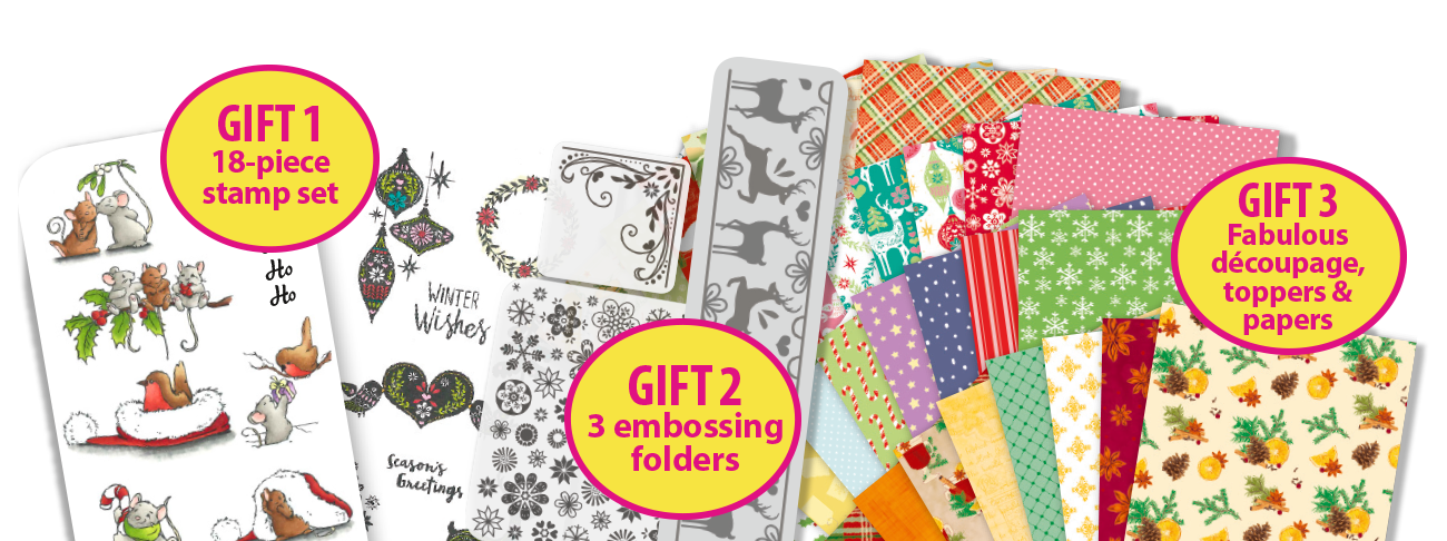 ✔ 18 clear stamps, featuring sweet mice and robins, plus wintry folk-themed designs