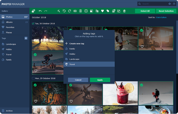Organize photos: Automatically compile albums from photos sorted by date and location. Tag your images, add them to favorites, or move them to an archive for ease of navigation.